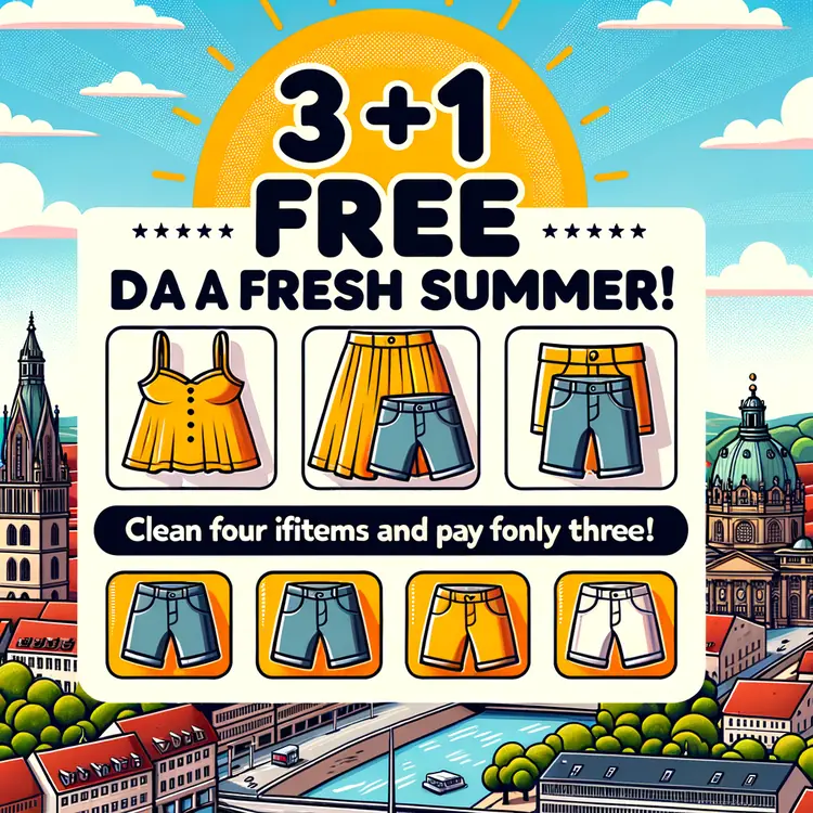 Angebot 3+1 — Bezahle 3, erhalte 1 gratis! Bringe vier gleiche Teile (gleicher Typ) zur Reinigung und zahle nur für drei. Perfekt für einen frischen Start in den Frühling in Stuttgart. Beispiel: Bringst du 8 Hosen, zahlst du nur 6.Unser Angebot 4 zum Preis von 3 startet am Samstag 13.04 ab 07:00 u